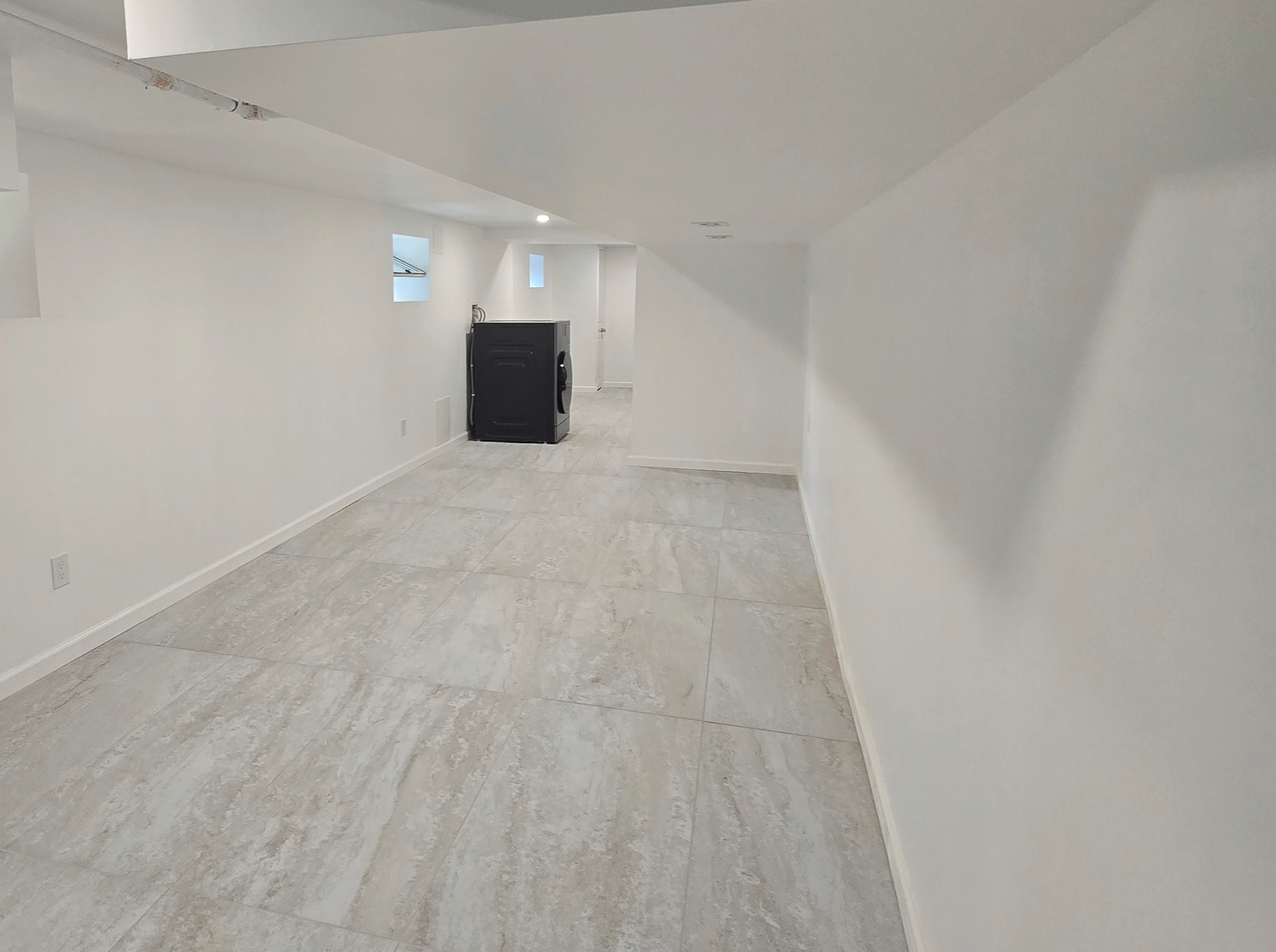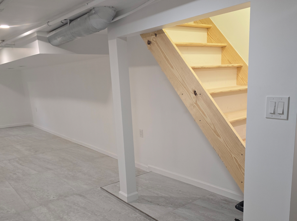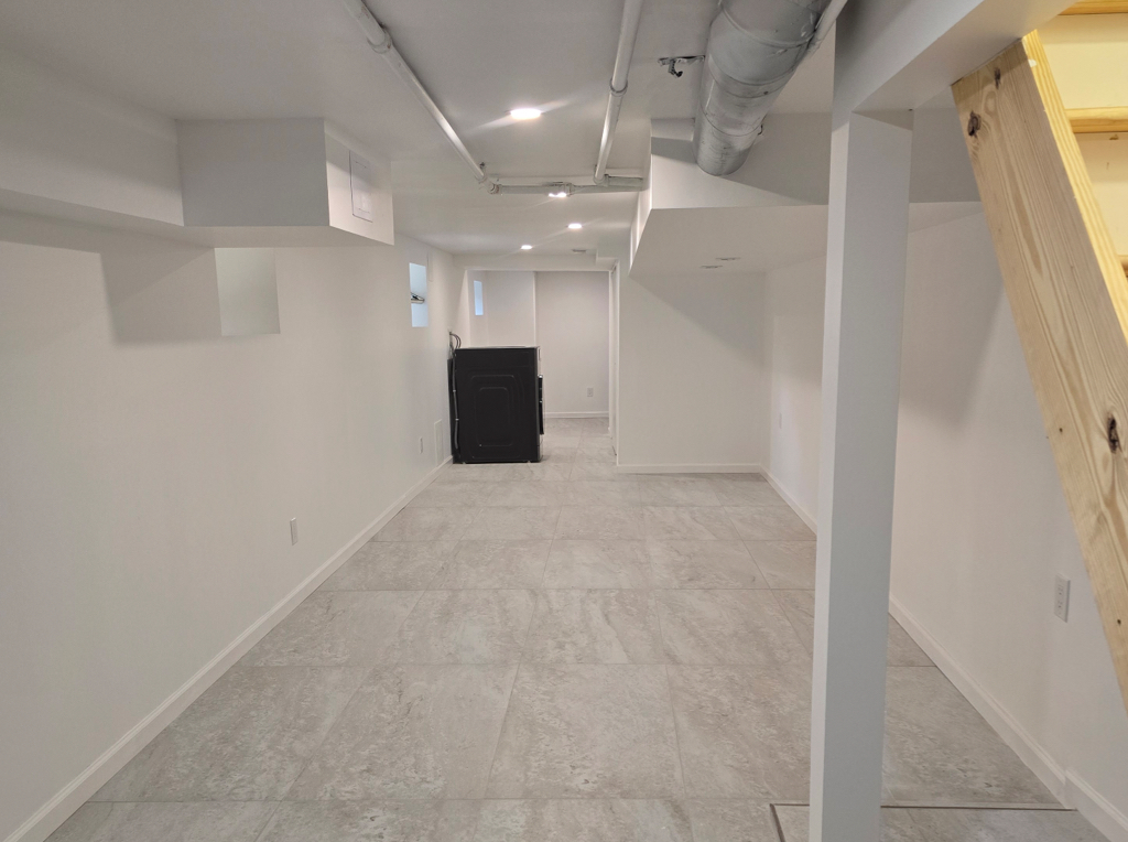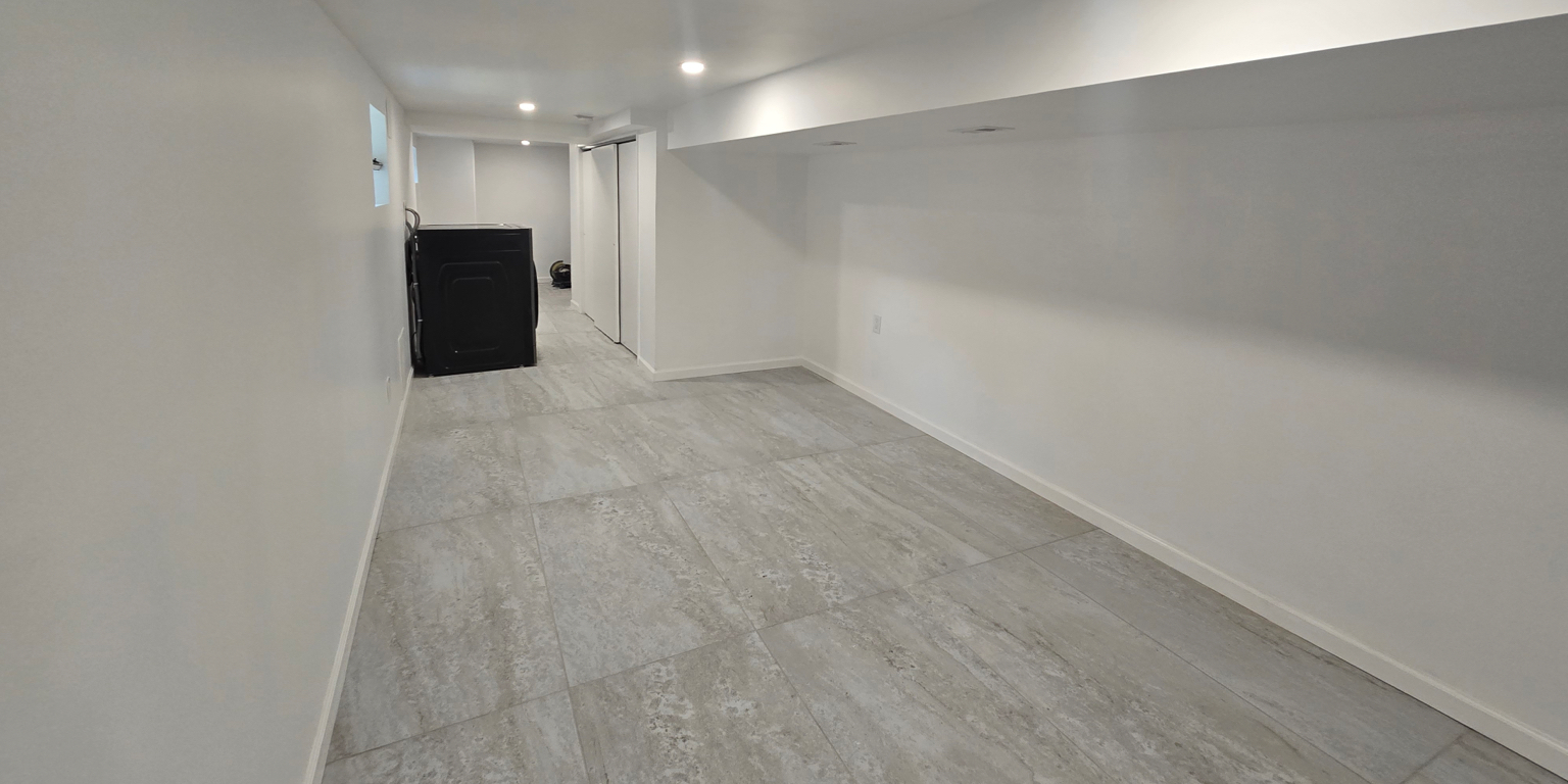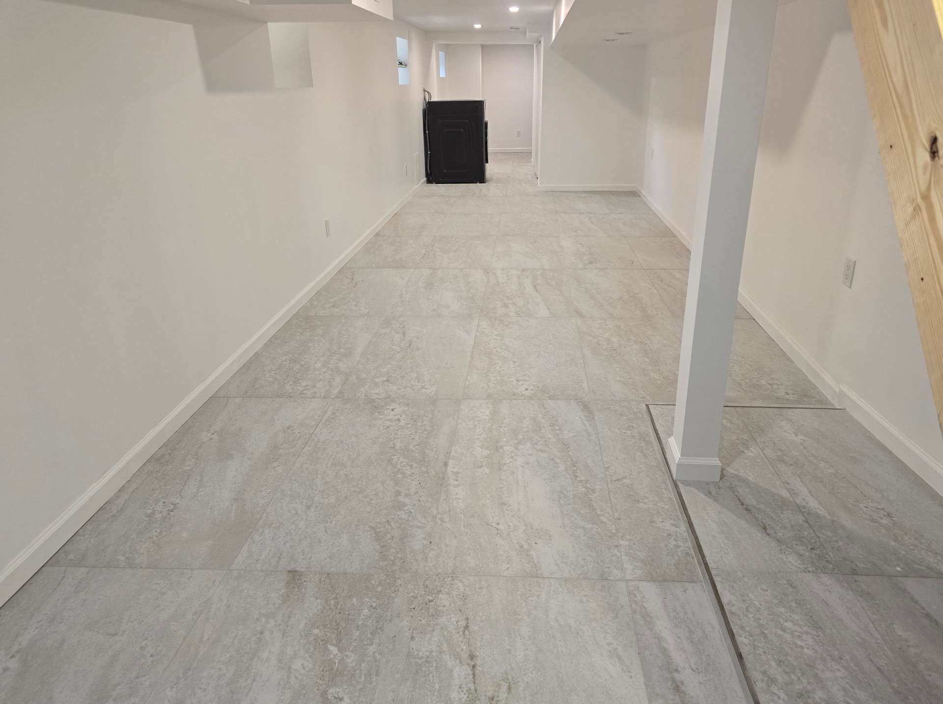 This basement transformation features large-format gray tiles, bright recessed lighting, and clean white walls for a polished, open feel. Simple details and smooth finishes create a fresh, functional living space.