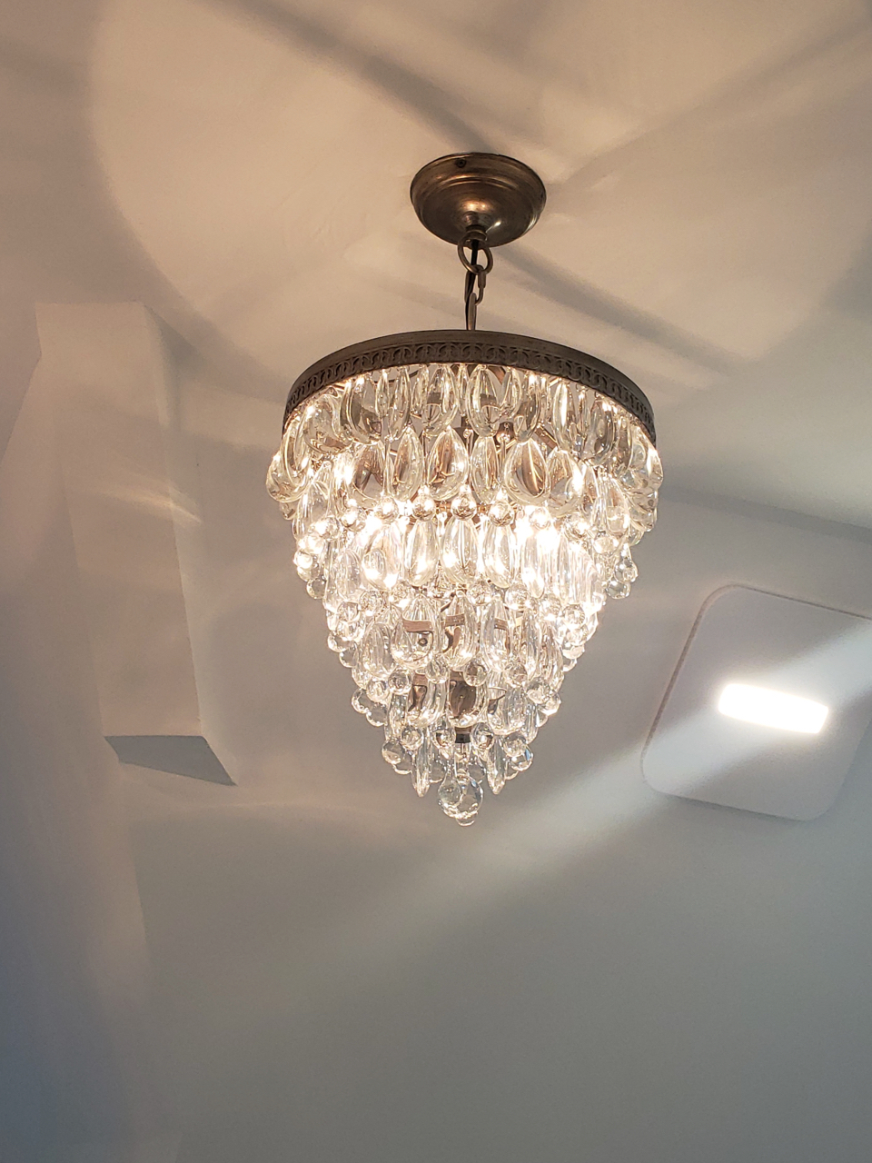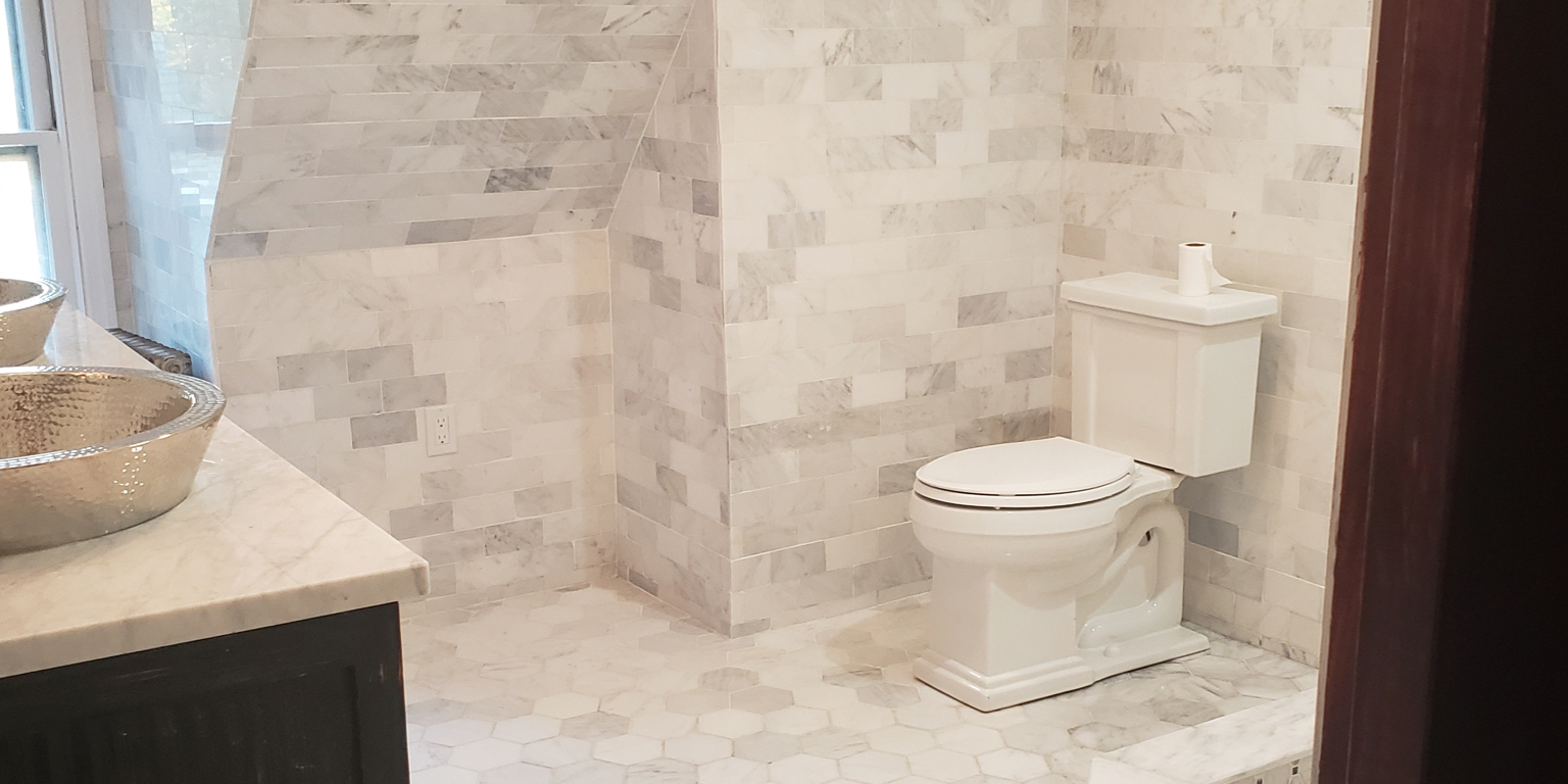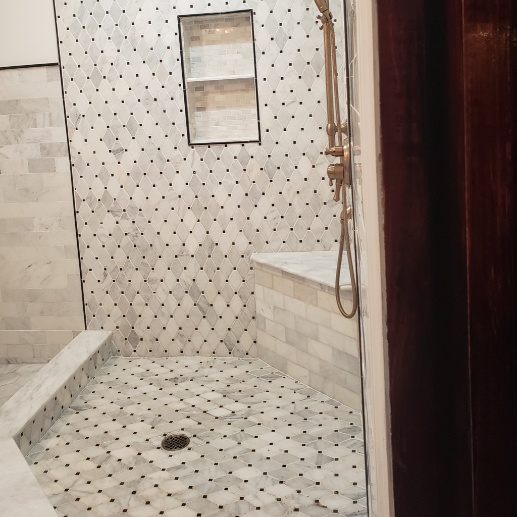 This bathroom features classic marble tilework from floor to ceiling, highlighted by a spacious glass-enclosed shower and brass fixtures. A crystal chandelier adds a touch of luxury, creating a timeless and elegant atmosphere.