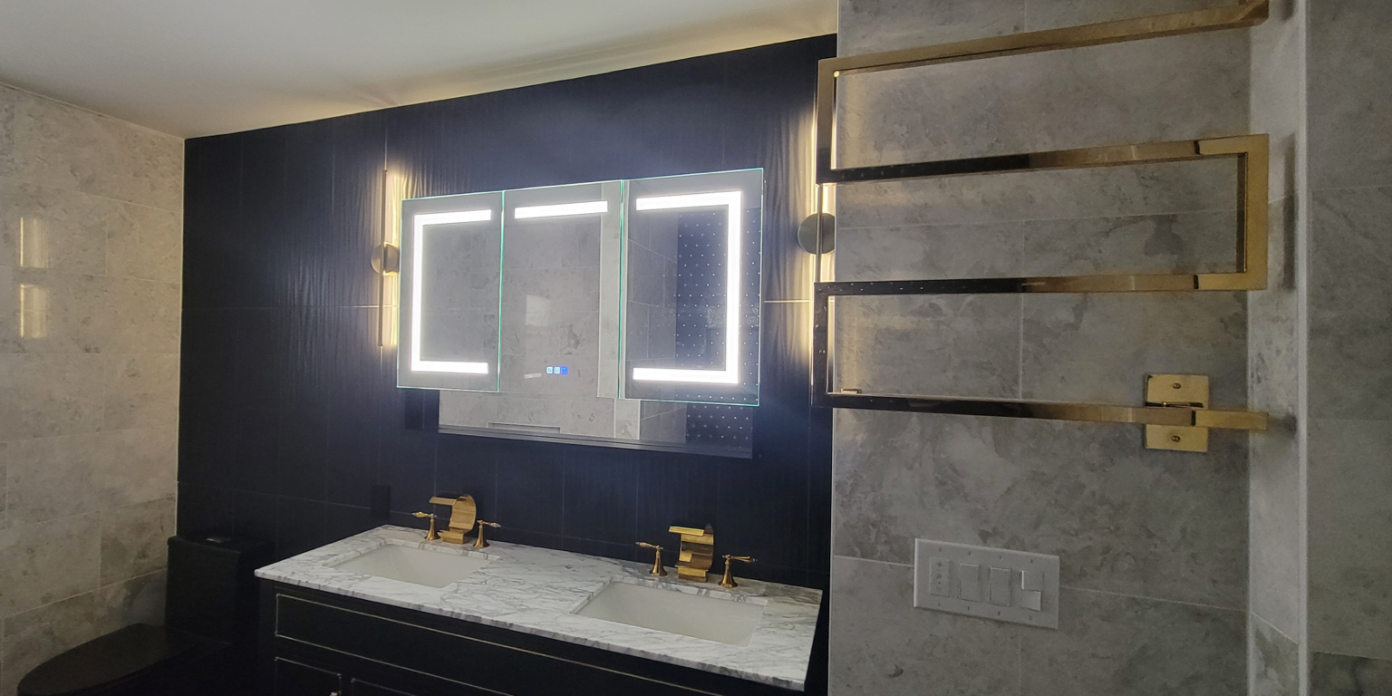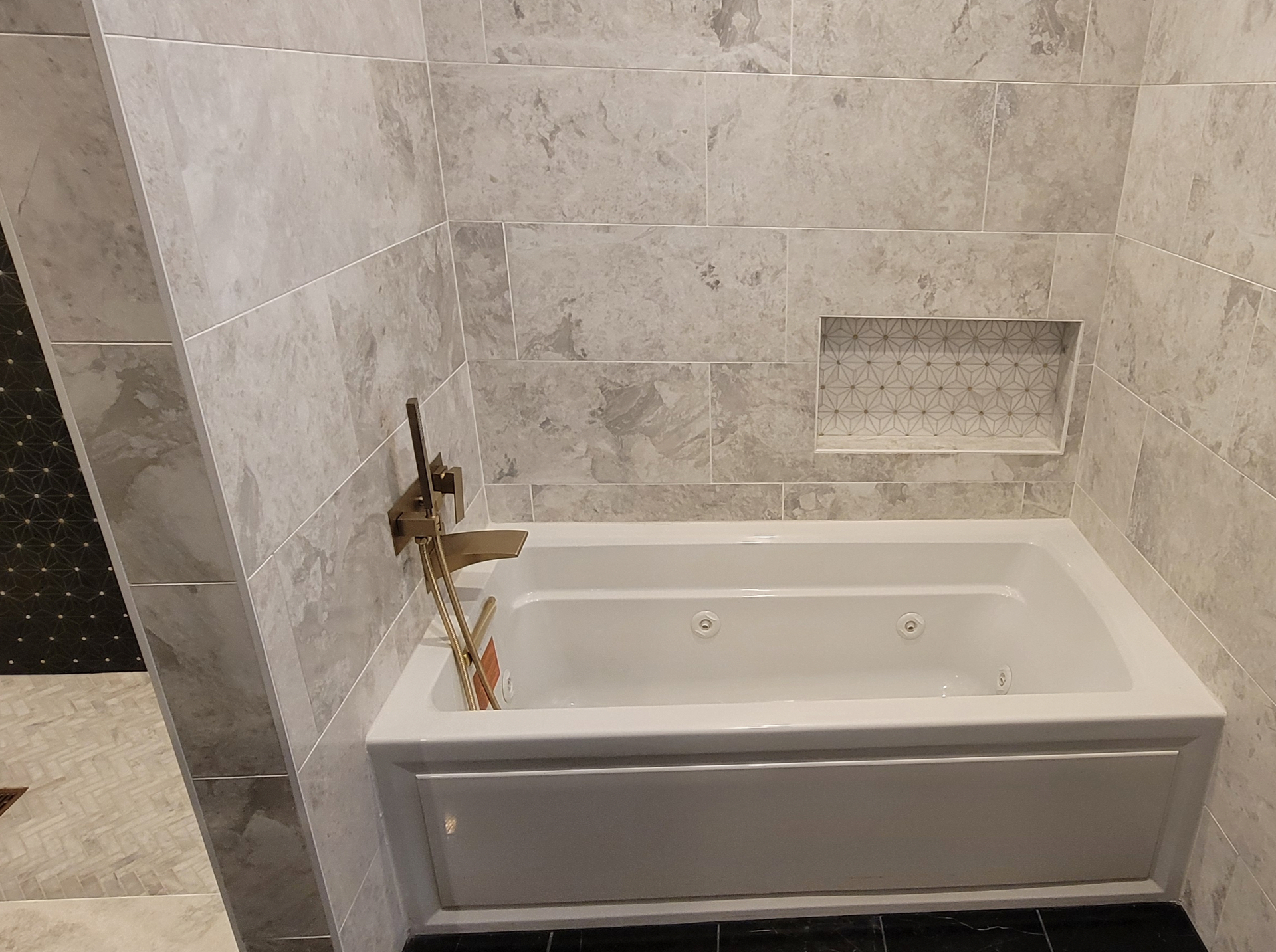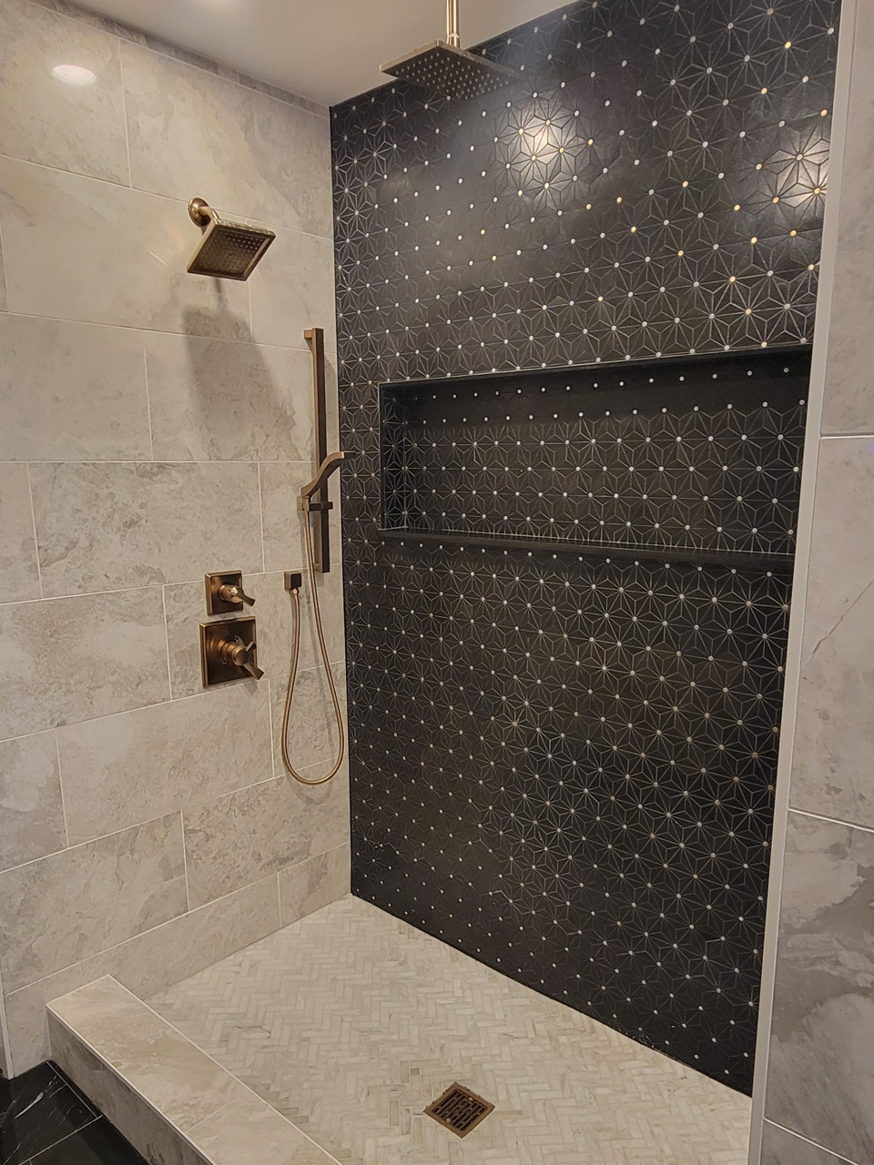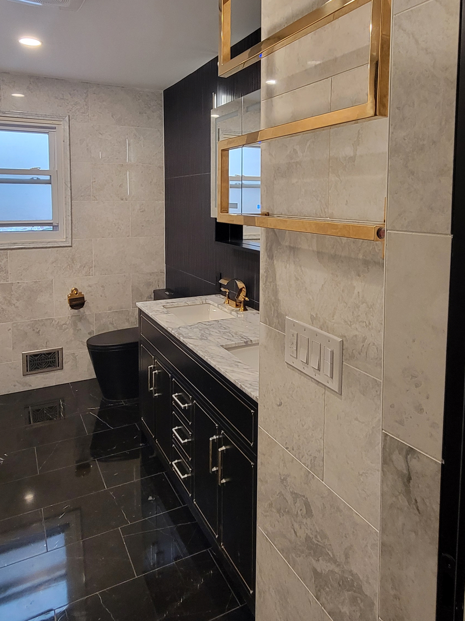 This modern bathroom features elegant marble tiles complemented by matte black textured walls, white marble walls, and brushed gold fixtures. A spacious walk-in shower with a rainfall head, a deep soaking tub with a matching gold faucet, and a sleek double vanity with illuminated mirrors create a luxurious spa like atmosphere.