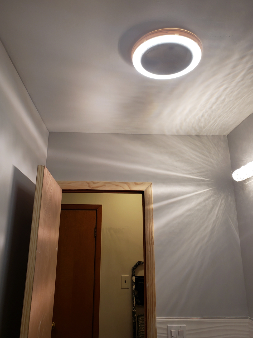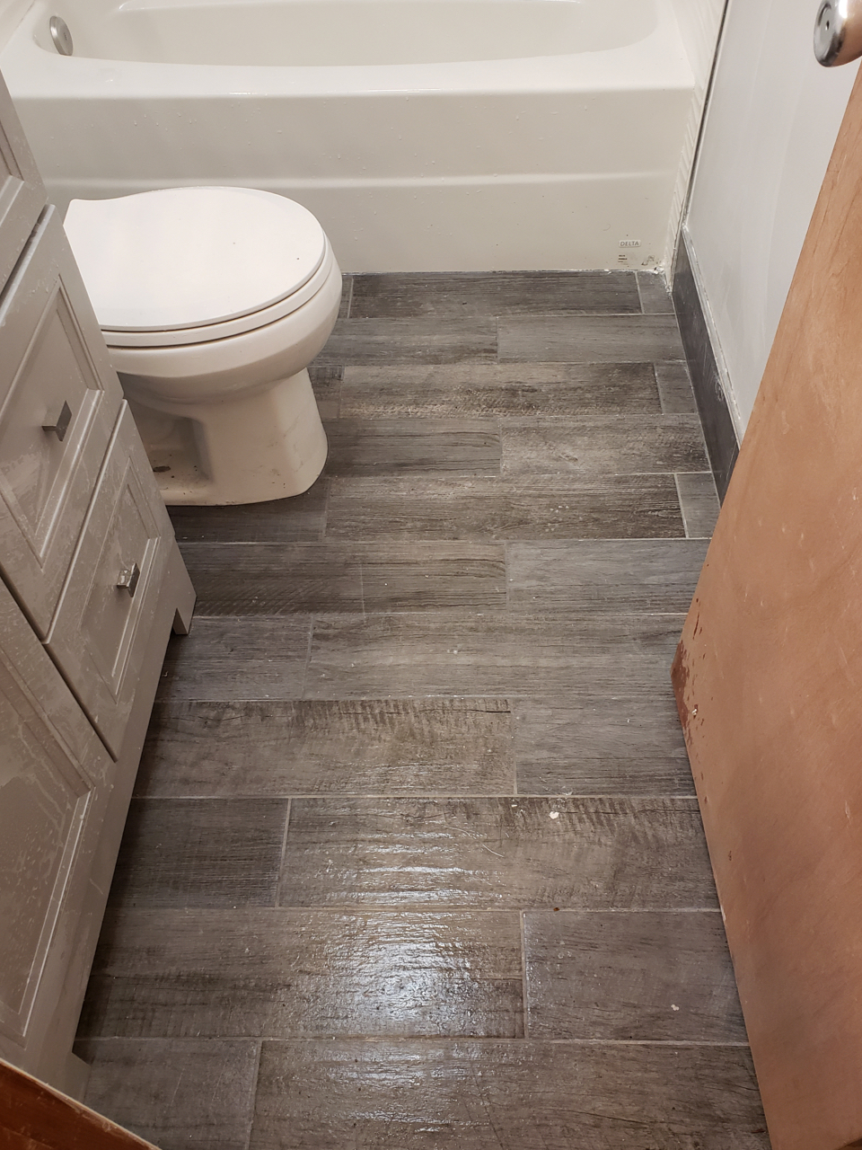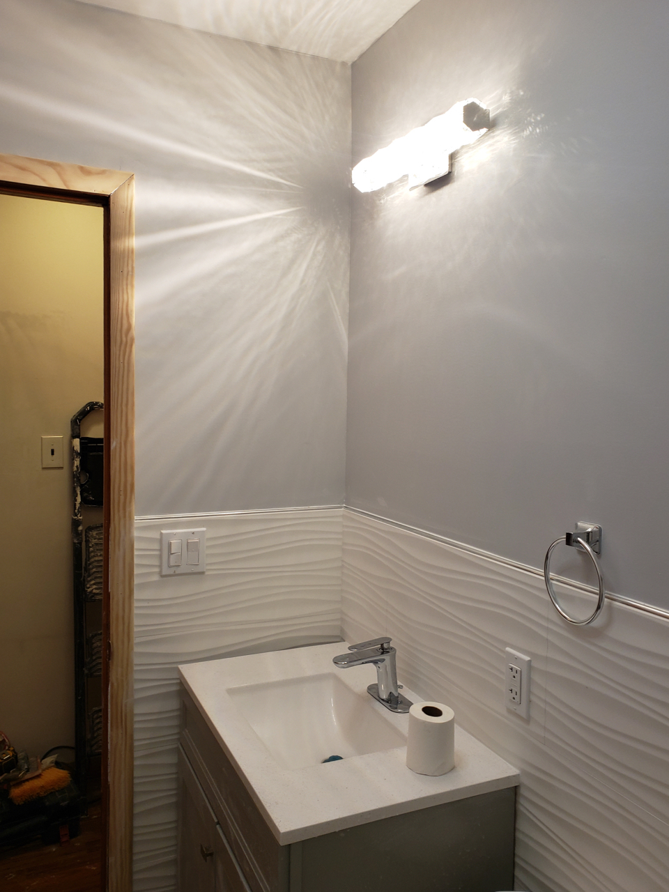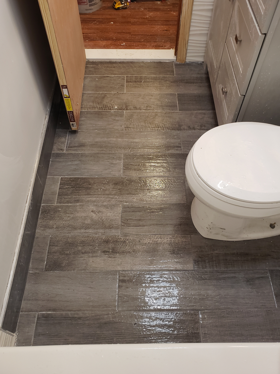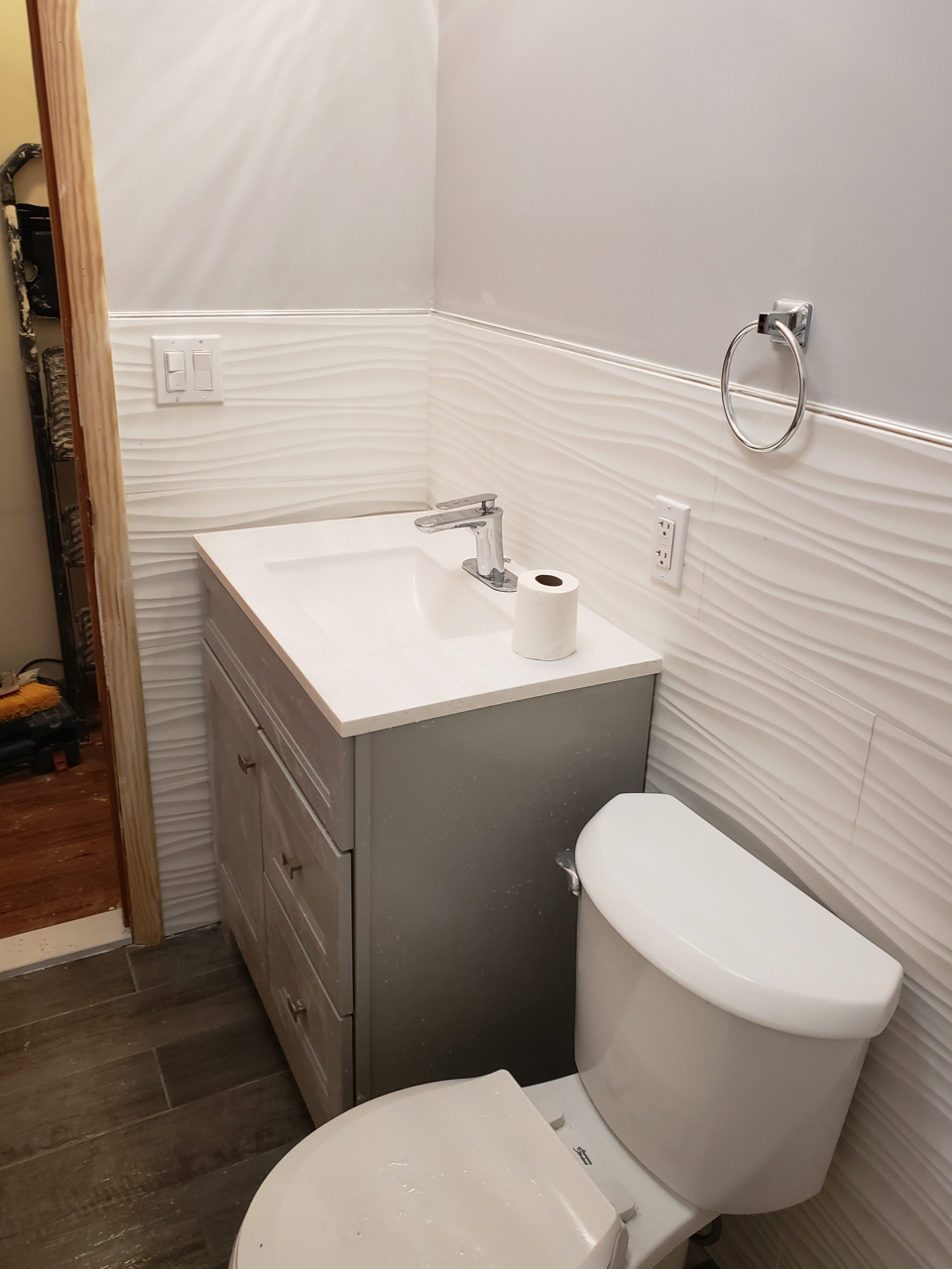 A sleek bathroom with textured wall tiles, modern fixtures, and gray wood-look flooring. The minimalist design and polished finishes bring a fresh, contemporary edge to the space.