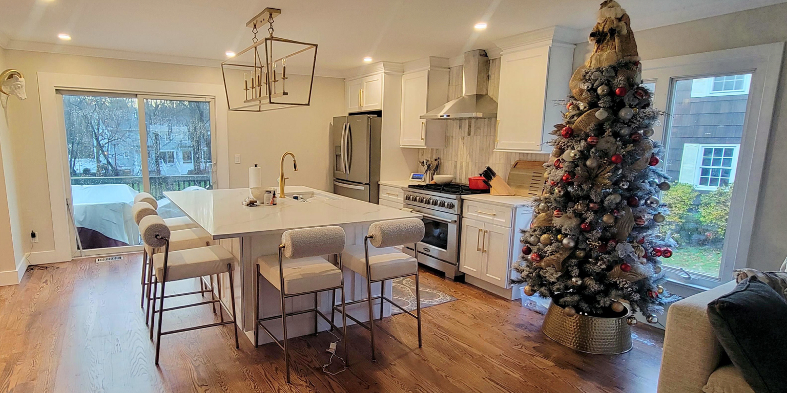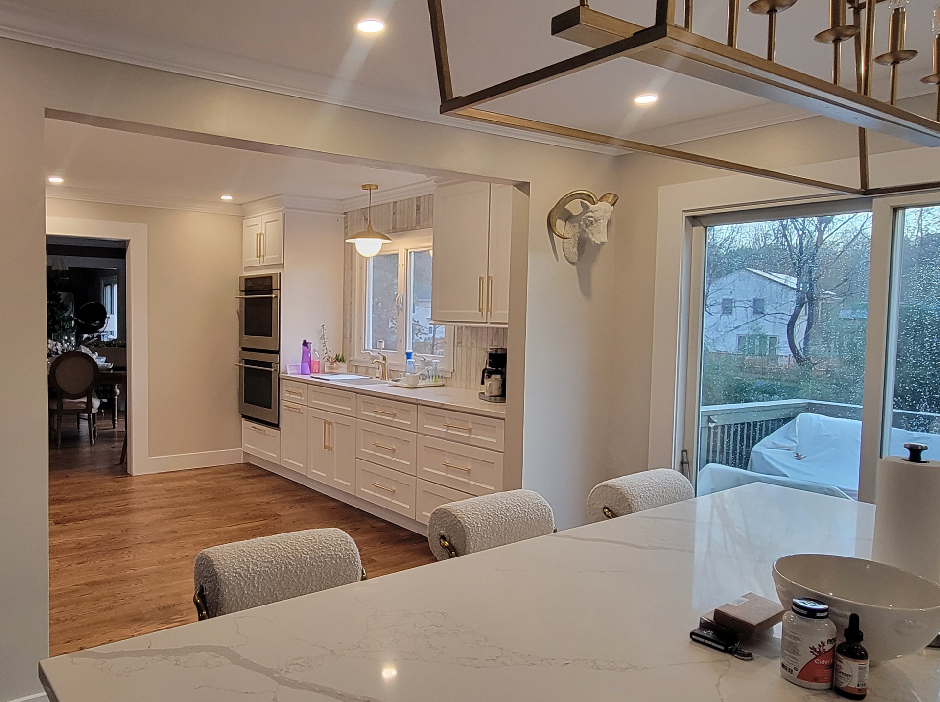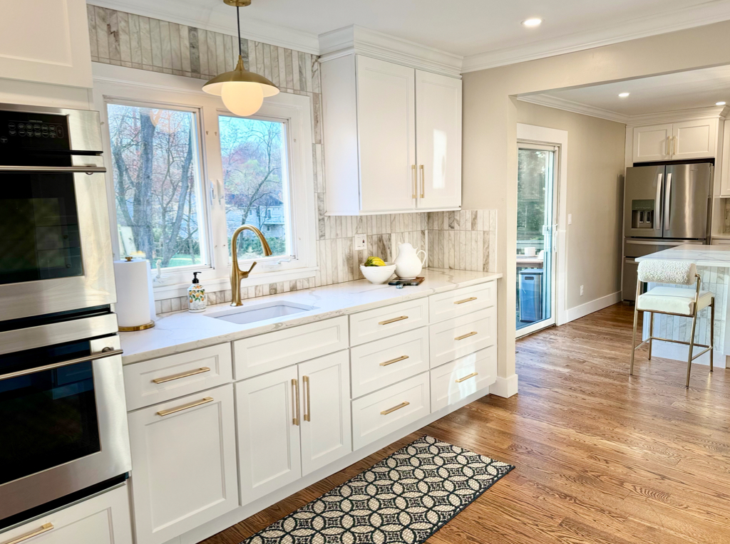 A bright modern kitchen featuring custom white shaker cabinets, a large 6’x8’ island, premium stainless steel appliances, and gold hardware accents. Warm hardwood floors, crown molding, and full height marble style backsplash bring an elegant finish. Natural light pours in through oversized windows and sliding doors, creating a spacious and inviting layout ideal for cooking and entertaining.