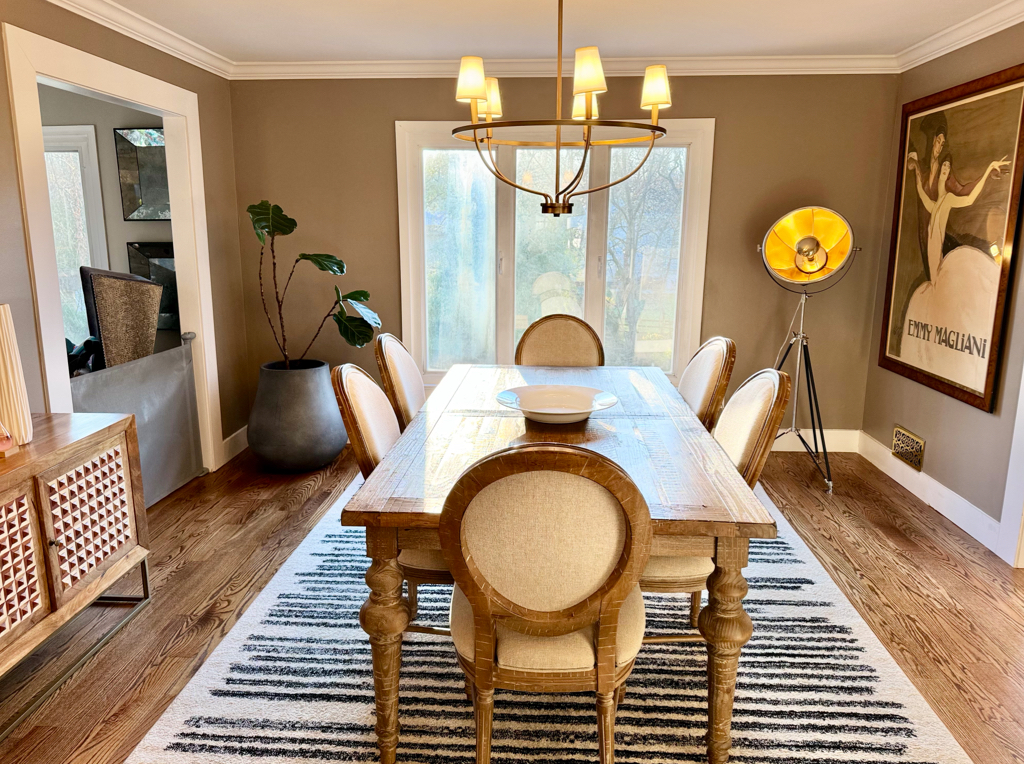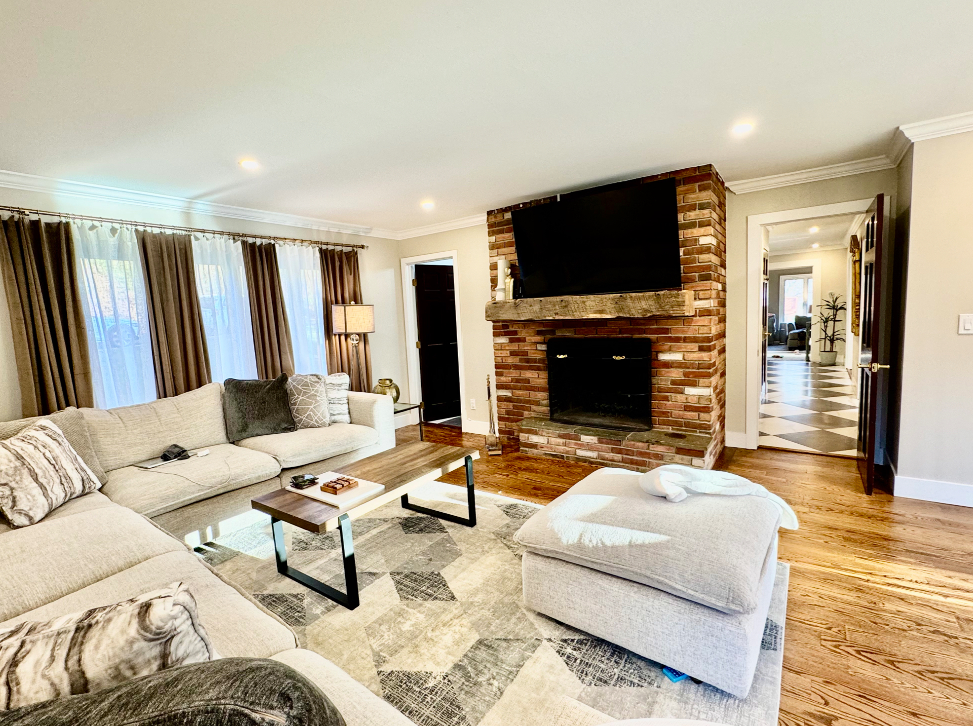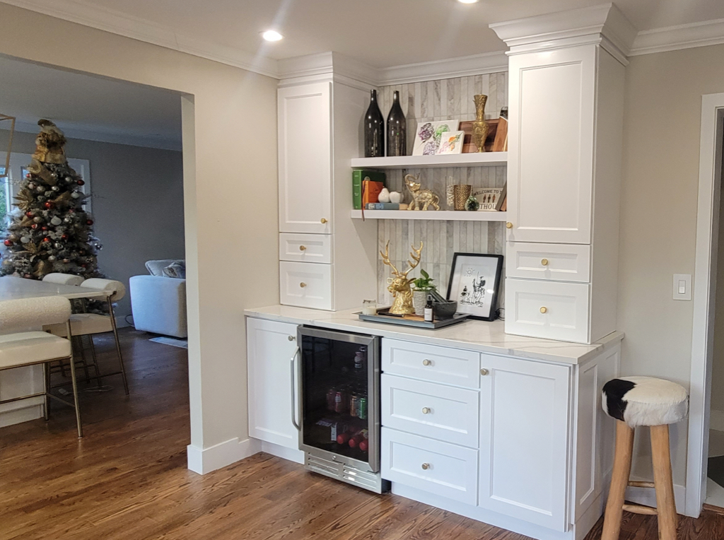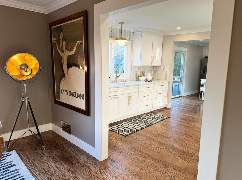 A bright modern kitchen featuring custom white shaker cabinets, a large 6’x8’ island, premium stainless steel appliances, and gold hardware accents. Warm hardwood floors, crown molding, and full height marble style backsplash bring an elegant finish. Natural light pours in through oversized windows and sliding doors, creating a spacious and inviting layout ideal for cooking and entertaining.