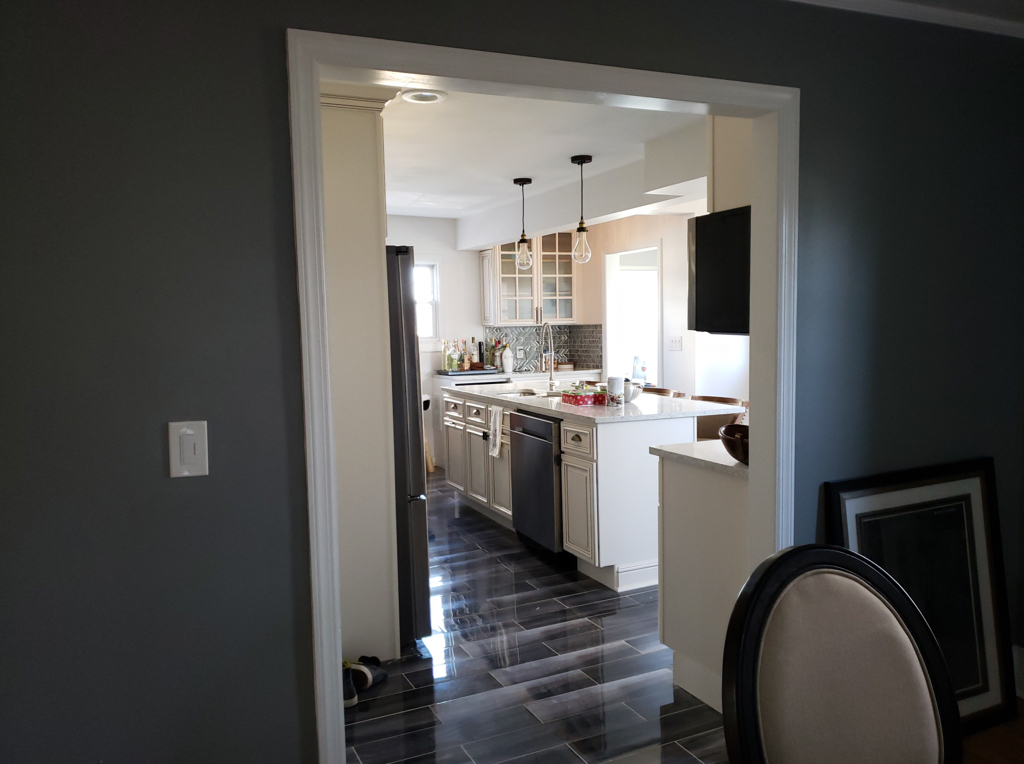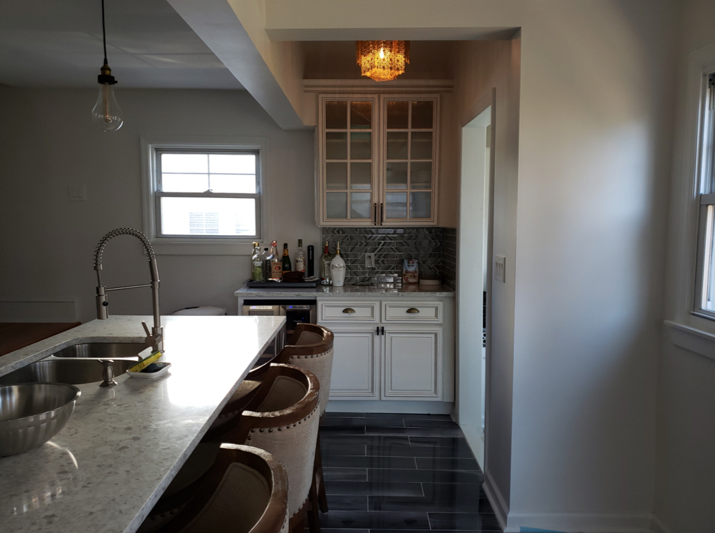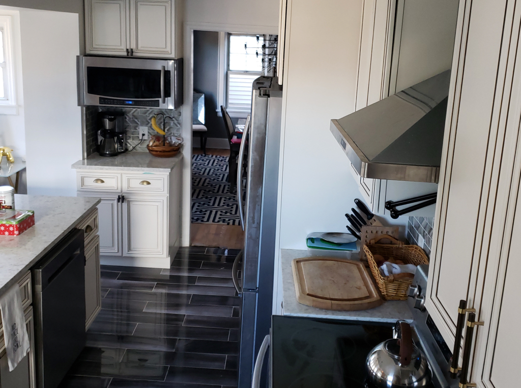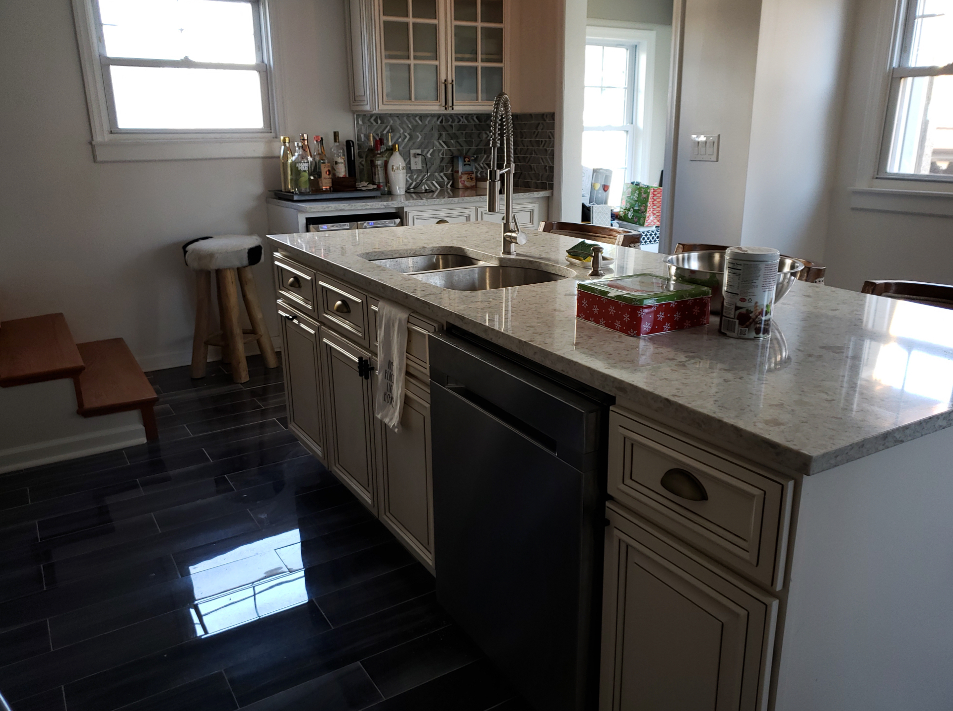 This kitchen blends timeless elegance with modern functionality. Featuring cream cabinetry, polished quartz countertops, and a sleek tile backsplash, it’s complemented by stainless steel appliances and dark glossy floors. The open layout and pendant lighting create a bright, inviting atmosphere perfect for both cooking and entertaining.