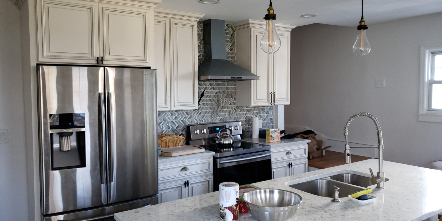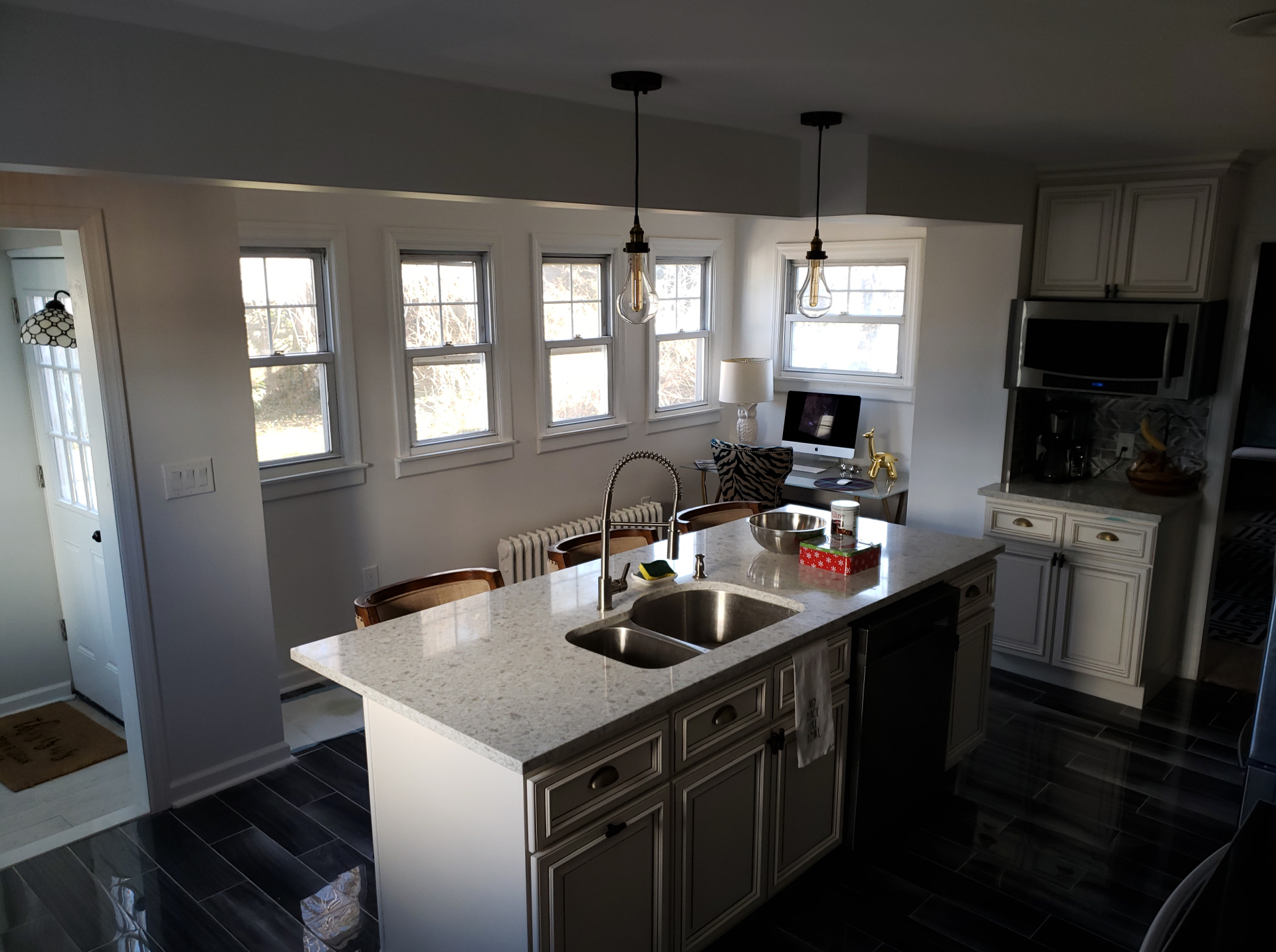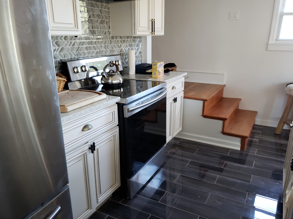 This kitchen blends timeless elegance with modern functionality. Featuring cream cabinetry, polished quartz countertops, and a sleek tile backsplash, it’s complemented by stainless steel appliances and dark glossy floors. The open layout and pendant lighting create a bright, inviting atmosphere perfect for both cooking and entertaining.