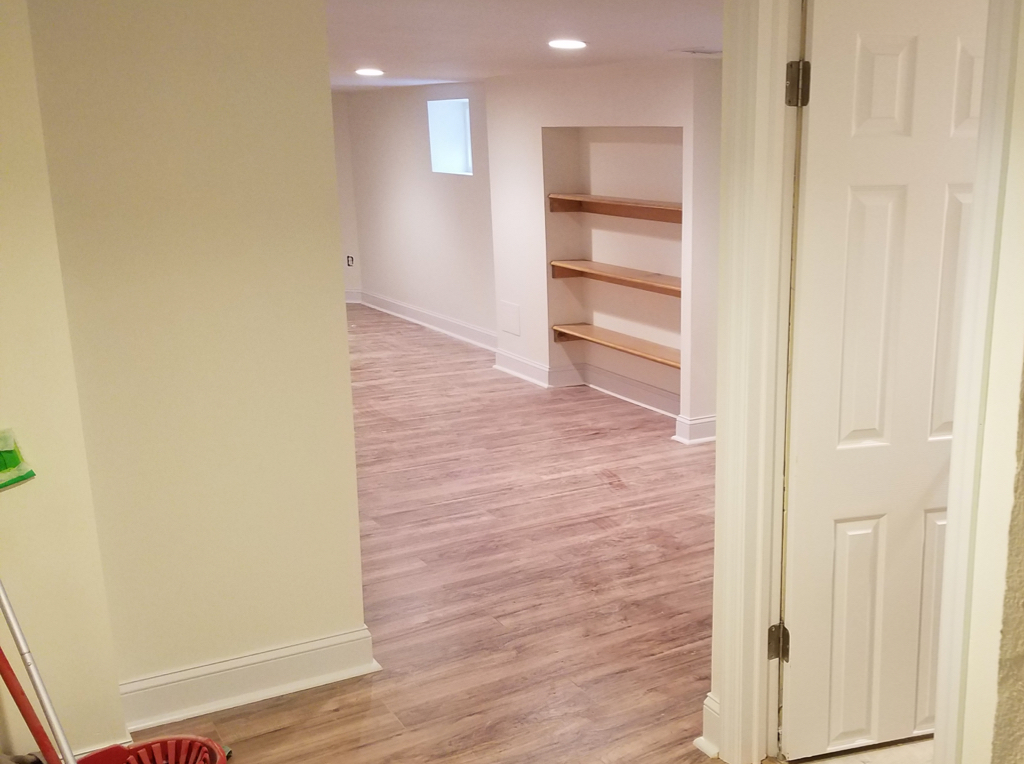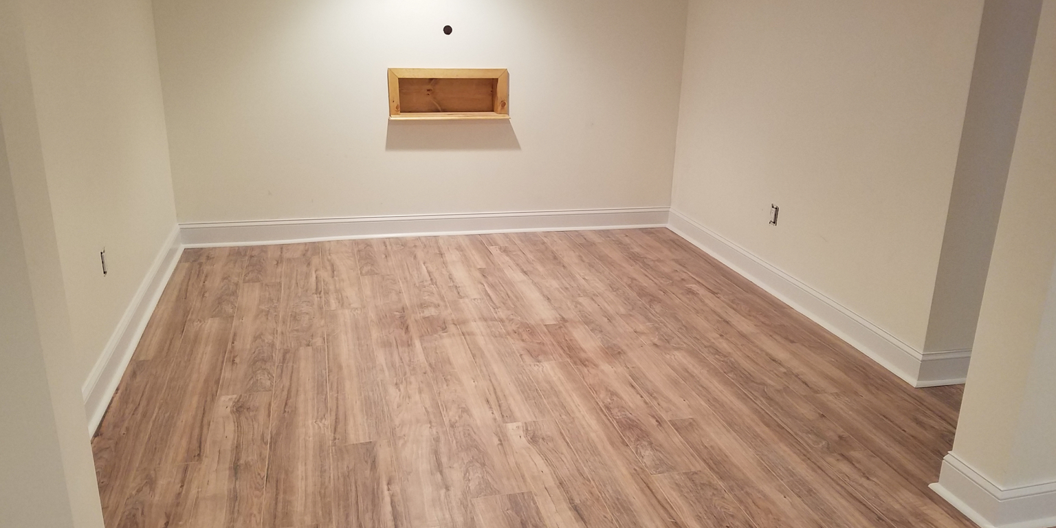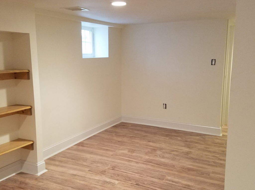 This finished basement features warm wood-look flooring and clean, neutral walls for a cozy, timeless appeal. Built-in shelving adds function and charm, making it an ideal space for relaxation or entertainment.