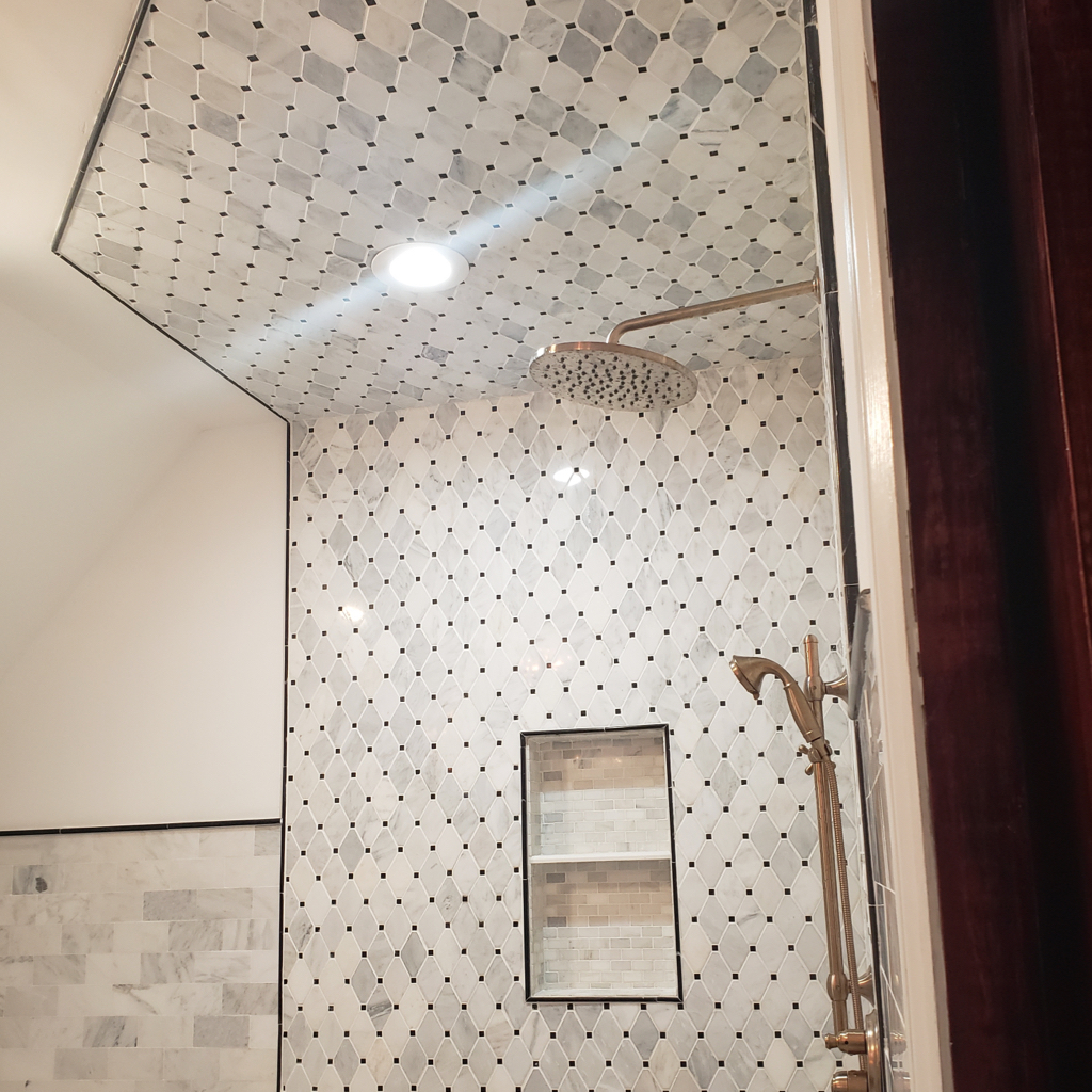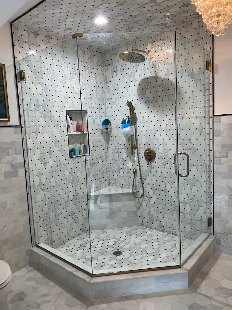 This bathroom features classic marble tilework from floor to ceiling, highlighted by a spacious glass-enclosed shower and brass fixtures. A crystal chandelier adds a touch of luxury, creating a timeless and elegant atmosphere.