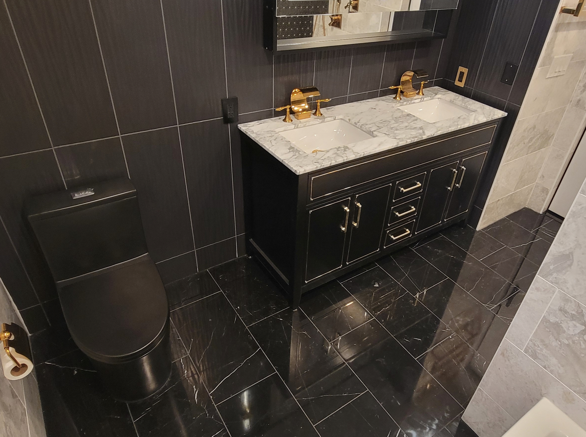 This modern bathroom features elegant marble tiles complemented by matte black textured walls, white marble walls, and brushed gold fixtures. A spacious walk-in shower with a rainfall head, a deep soaking tub with a matching gold faucet, and a sleek double vanity with illuminated mirrors create a luxurious spa like atmosphere.