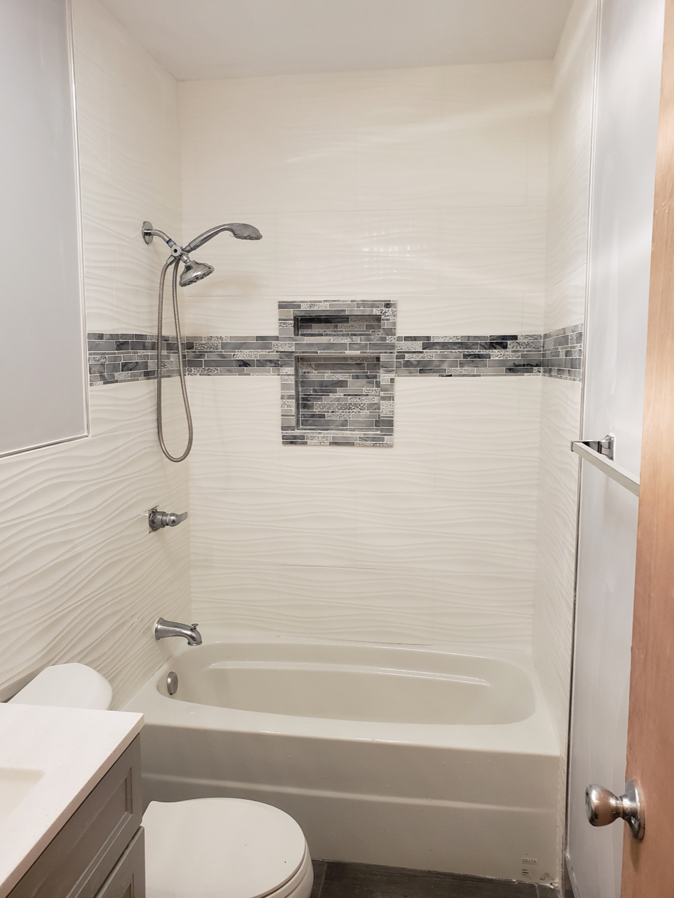 A sleek bathroom with textured wall tiles, modern fixtures, and gray wood-look flooring. The minimalist design and polished finishes bring a fresh, contemporary edge to the space.
