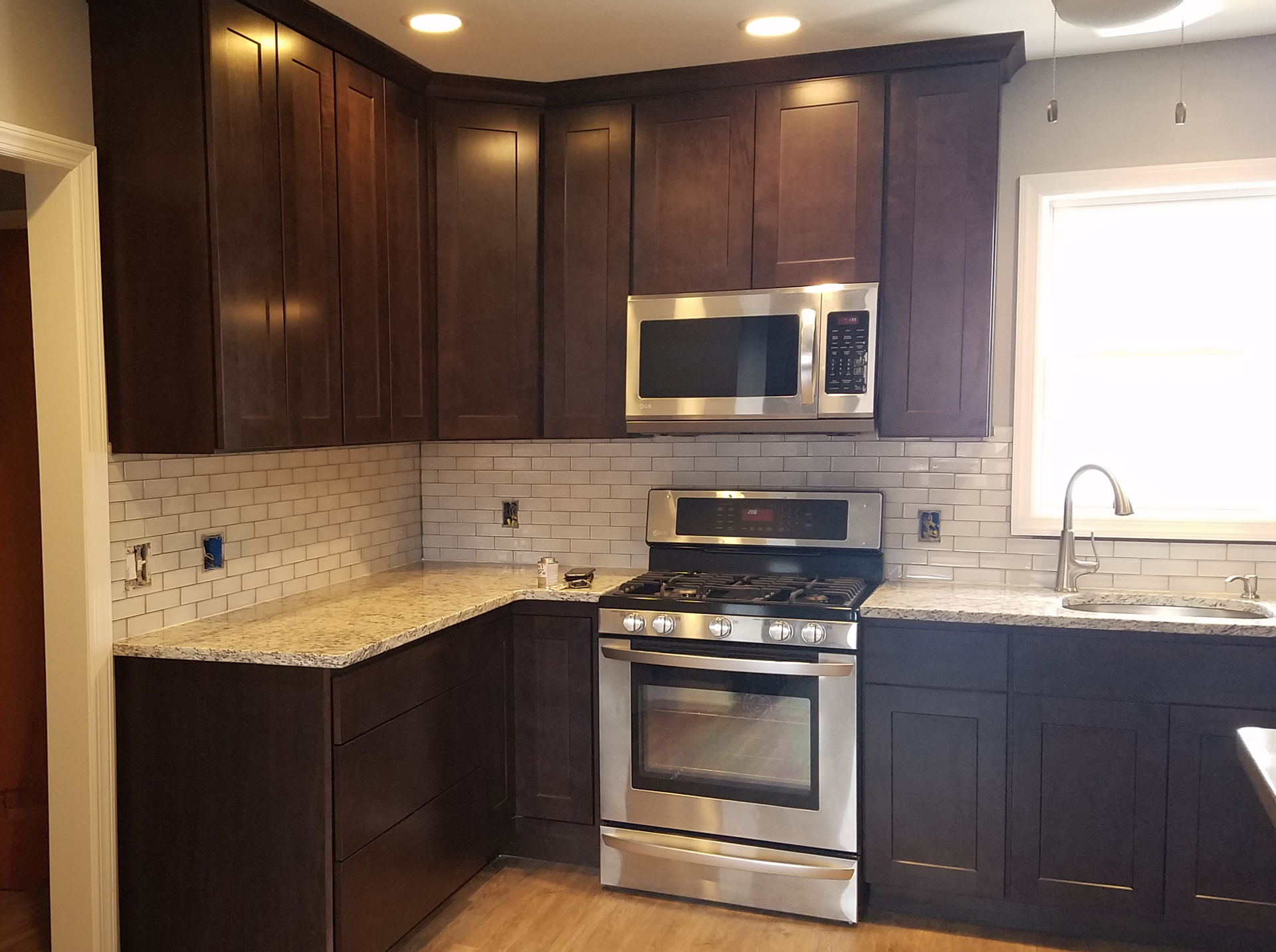 A sleek kitchen with dark cabinetry, bright granite counters, and a crisp subway backsplash. Paired with warm wood floors, this design blends modern simplicity with everyday comfort.